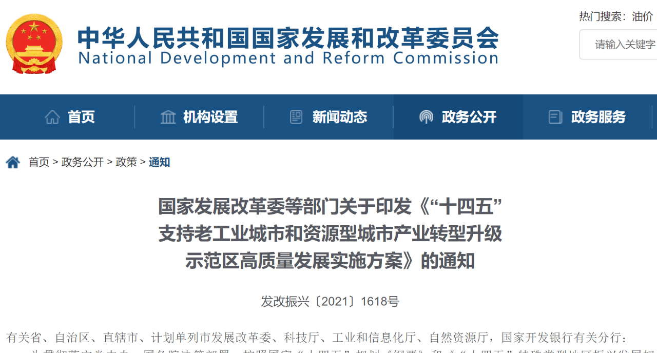 國(guó)家發(fā)展改革委等部門關(guān)于印發(fā)《“十四五”支持老工業(yè)城市和資源型城市產(chǎn)業(yè)轉(zhuǎn)型升級(jí)示范區(qū)高質(zhì)量發(fā)展實(shí)施方案》的通知